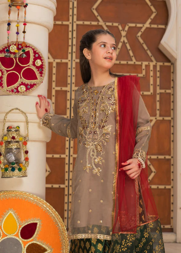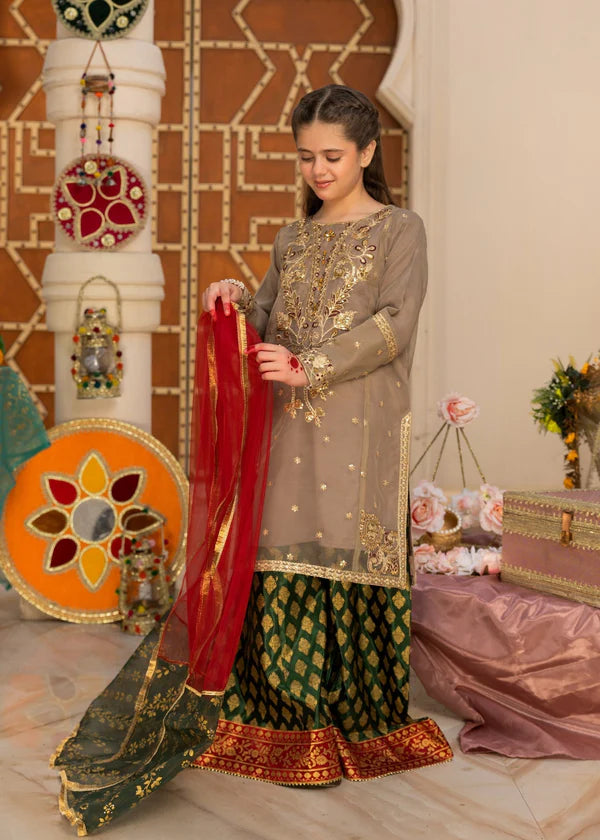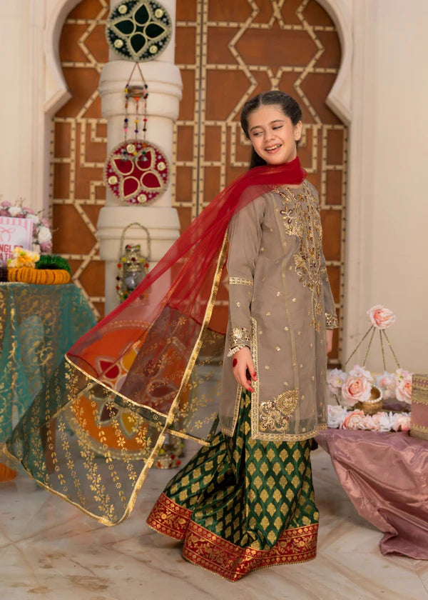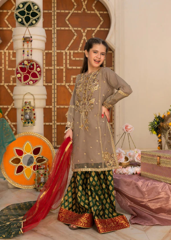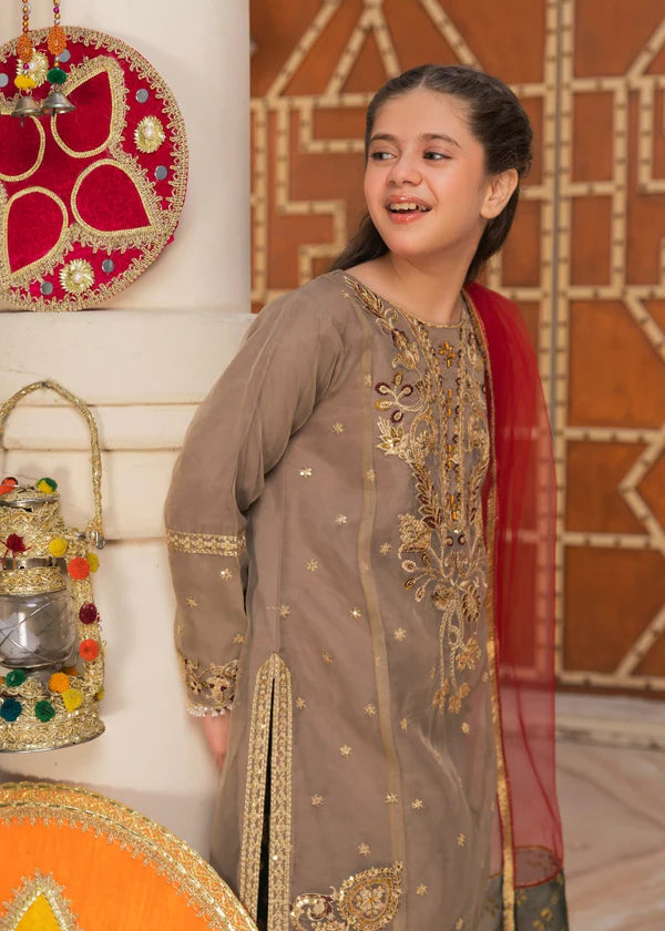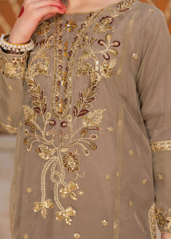 Additional Description: Elegant organza shirt adorned with tilla and thread embroidery, featuring delicate handwork on the neckline. Paired with a gold-print sharara and a net dupatta finished with a gold-print border. Stitched with grip lining for a comfortable and refined fit.