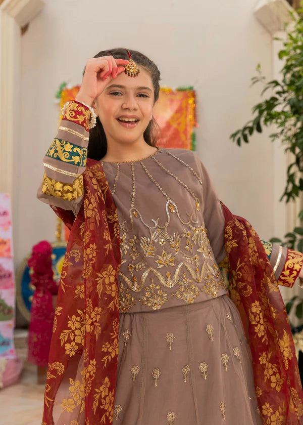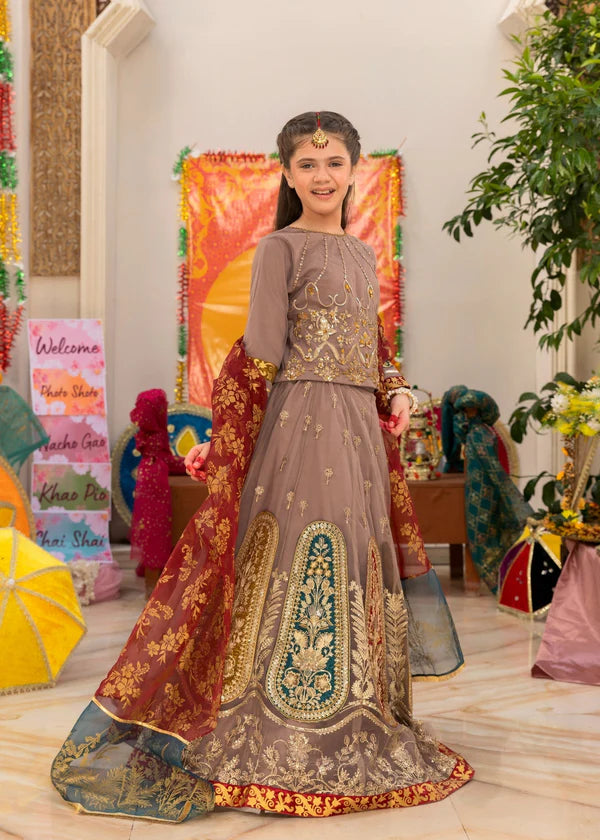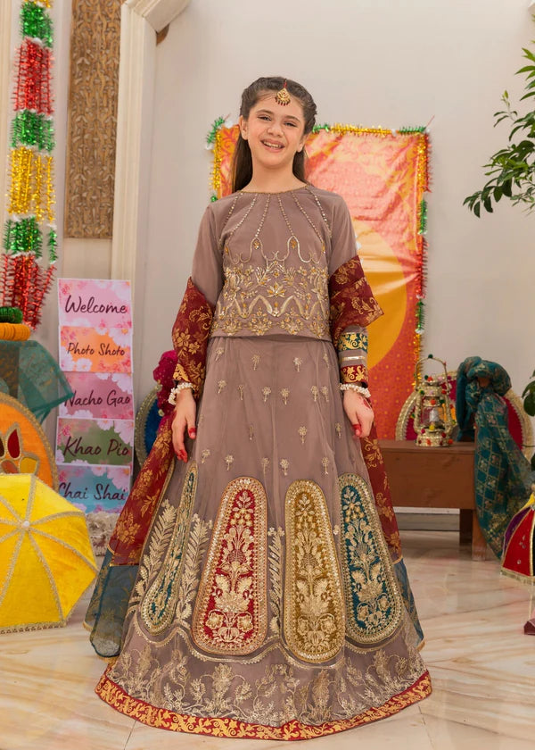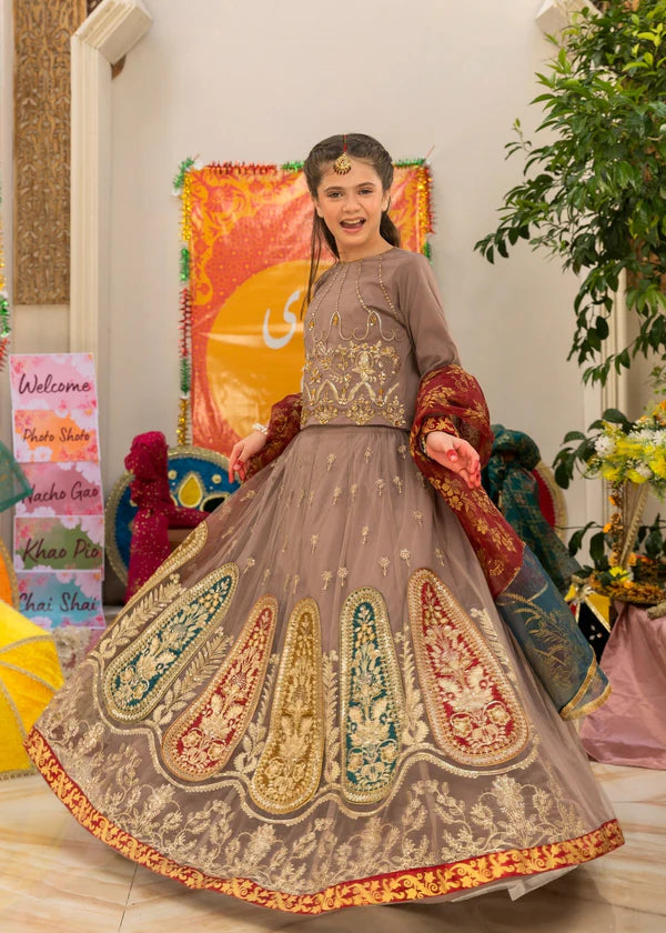 Additional Description: A graceful net kurti adorned with tilla and thread embroidery, paired with a net embroidered lehnga and an organza dupatta. Beautifully embellished with delicate handwork of beads and sequins, the ensemble is stitched with grip lining and finished with a cancan border for added flair and structure.